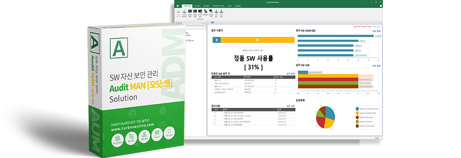 SW감사(Audit) + 보안 기능이 최적화된 SW 관리 시스템! PC에 설치된 SW 관리와 중소 기업 필수 솔루션인 매체 제어, 원격 제어, 메시지 전송 등의 다양한 기능을 함께 제공합니다.